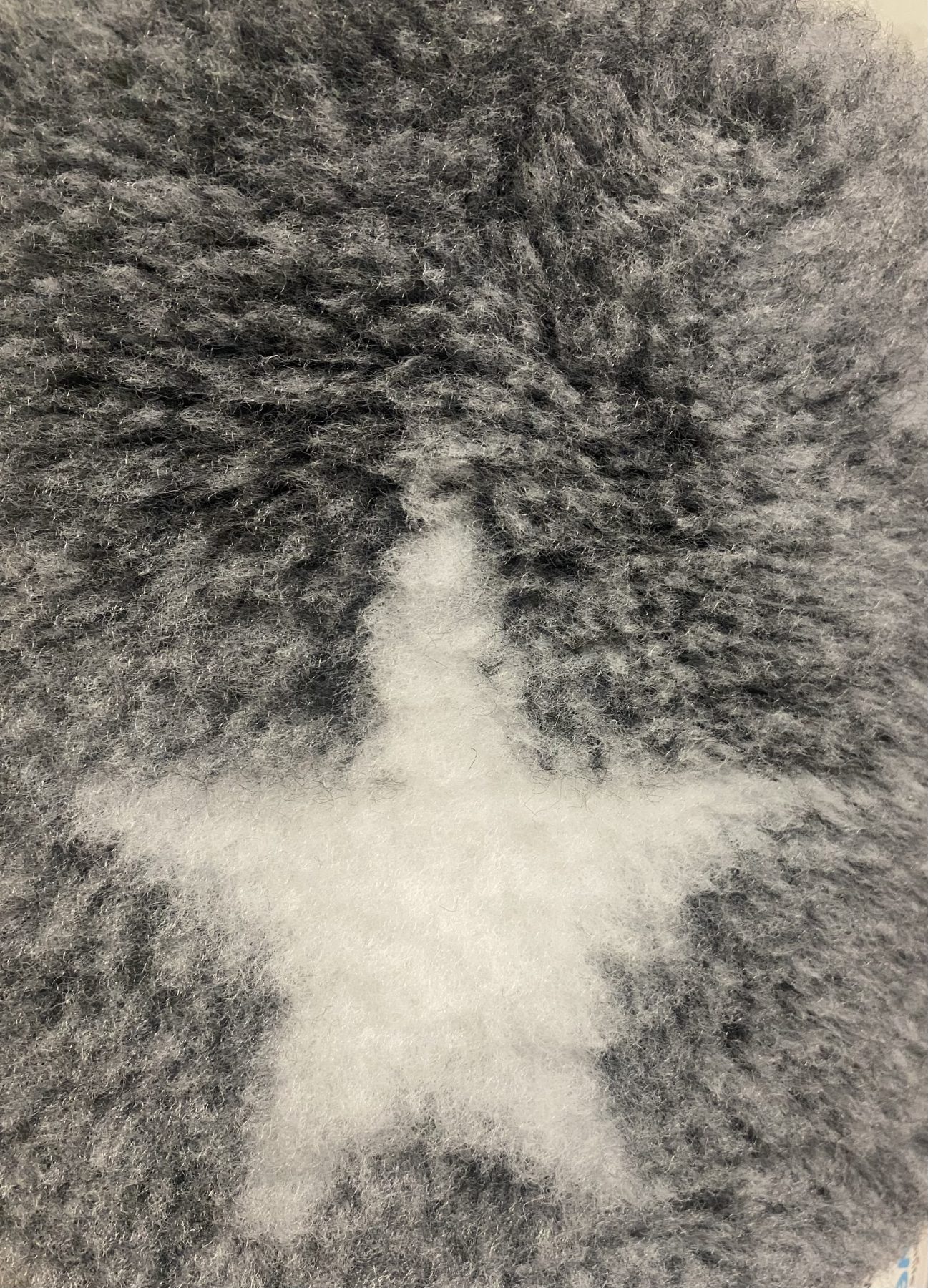 Vet bed grå med hvite stjerner og sorte pote avtrykk